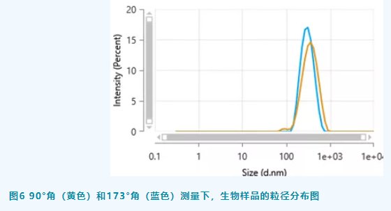 當測試的樣品為粒徑寬分布時,比如一些生物樣品,兩種測量角度得到的粒徑分布圖就會有區別(見圖6)。