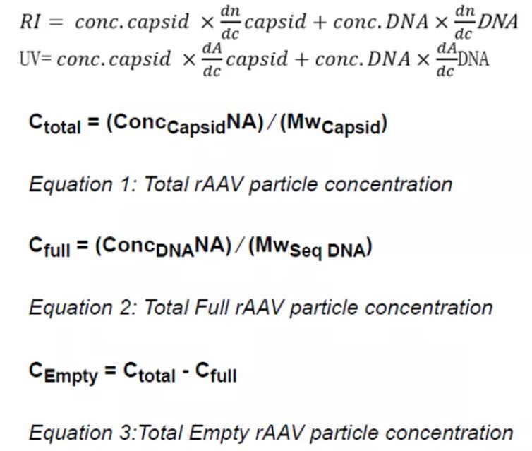 對于主體的單體峰,計算出其混合物分子量為4.49×106g/mol,其中86%為衣殼。rAAV5的蛋白質組分的分子量為3.89×106g/mol,這與表1中Empty rAAV5 的數據一致。單體是總體的93.2%,樣本的總滴度為7.48x1013VP/ml。其中單體包含78% Full rAAV5,22% Empty rAAV5。需要注意的是,這種分析方法假設樣品要么是Full ,要么是Empty ,忽略部分裝載或過度裝載情況。