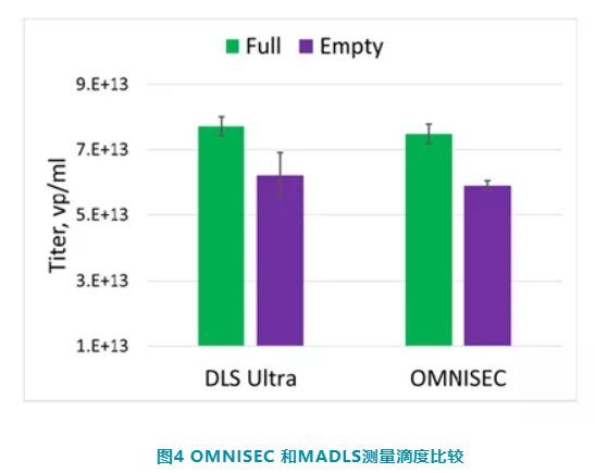 Zetasizer Ultra納米粒度及電位儀可以使用MADLS方式快速確定病毒滴度。從OMNISEC獲得的數據與Zetasizer Ultra的粒子滴度進行了比較,兩種技術之間有很好的相關性,見圖4。