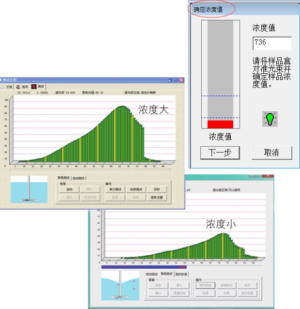 粒度分布測量中所顯示的“濃度”一般是所接收的光信號的大小,是與顆粒數目有關的量,一般稱光學濃度而不是百分比濃度。對激光法來說,懸浮液中顆粒數越多,光學濃度越大(但如果顆粒太多,光被超量遮擋,光學濃度反而減小);對沉降法來說,懸浮液中顆粒數 越多,光學濃度越小。