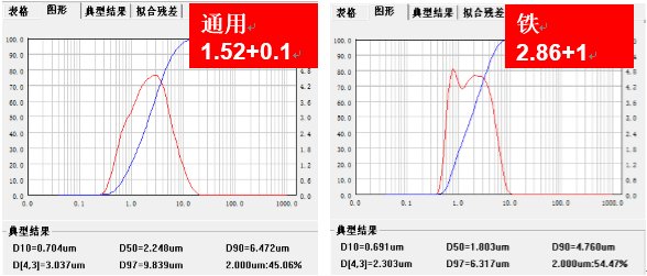 2、折射率發(fā)生改變:現(xiàn)代激光粒度儀一般采用Mie散射理論,選擇正確的折射率直接決定了測(cè)試結(jié)果的準(zhǔn)確性,正確的折射率可以通過系統(tǒng)或測(cè)量來得到。下圖是同一樣品不同折射率時(shí)的測(cè)試結(jié)果差異。