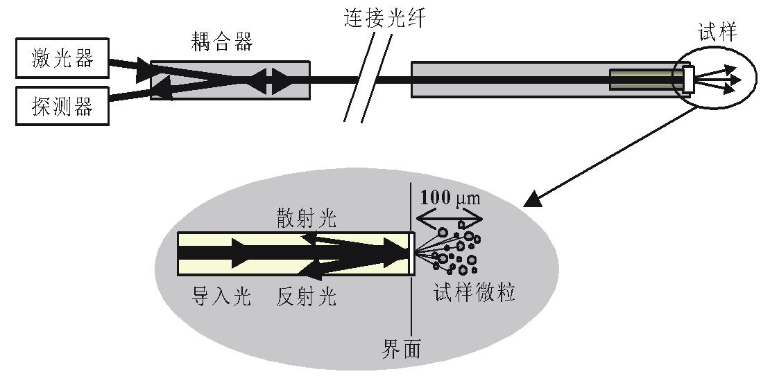 上圖是后向散射光測量的示意圖。激光器發出的光經 2+1 光耦合器進入一單模光纖。激光從光纖射出被納米顆粒散射后,其散射光又被該單模光纖接收,疊加在光纖端表面并返回,經光耦合器到達光探測器被檢測。對檢測到的信號作傅里葉變換得到動態光散射信號的功率譜,然后對不同頻段的功率譜信號用 Stocks-Einstein 公 式處理,就可以得到納米顆粒的粒度分布。
