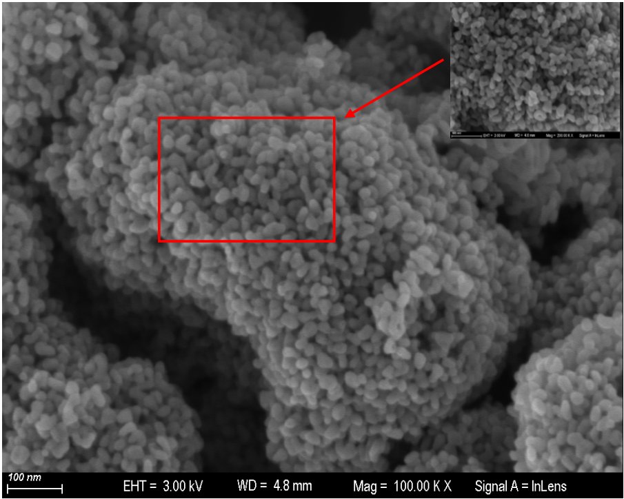 可以看出,該二氧化鈦顆粒是由大量“原始”顆粒聚集而成,而前面圖片一只是在方框內(nèi)的局部放大照片而已。