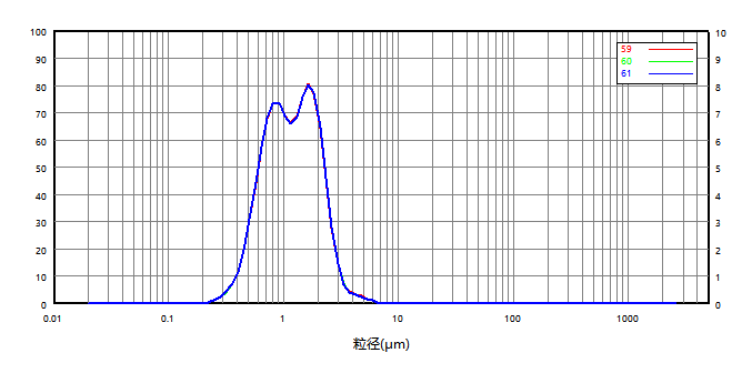 隨著測(cè)試鏡頭進(jìn)一步拉遠(yuǎn),我們可以發(fā)現(xiàn),實(shí)際上二氧化鈦存在大量“團(tuán)聚體”結(jié)構(gòu),而且這些團(tuán)聚體可能才是我們二氧化鈦真實(shí)存在的狀態(tài),而激光粒度儀檢測(cè)的正是這些團(tuán)聚的顆粒,結(jié)果如下。