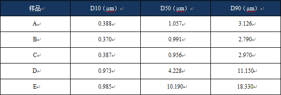 從表1中可以看出,樣品A、B、C三種的平均粒徑在1 μm左右,是較為理想的指標,樣品D的平均粒徑在4 μm,超過理想的粒度指標,而樣品E的平均粒徑超過10 μm,極可能影響鋰離子在電極活性材料中的固相擴散,進而降低電池的有效放電量。