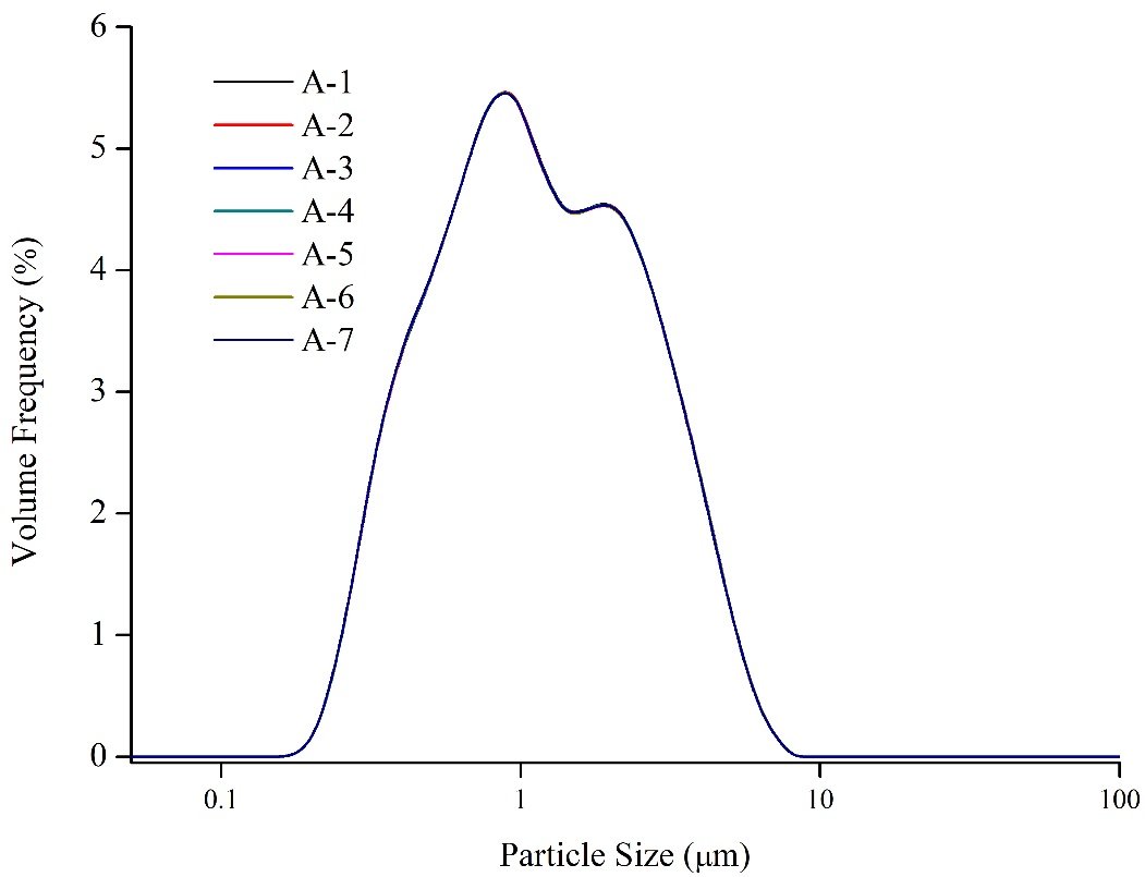 那么,用百特激光粒度儀測試鋰電池的正極材料的適用性怎樣呢?我們選擇了一種磷酸鐵鋰,連續測試7次,其中D10、D50和D90的重復性分別為0.13%, 0.07% 和 0.09%,這個精度遠遠低于激光粒度儀國際標準ISO13320的要求。因此采用Bettersize2600激光粒度儀檢測磷酸鐵鋰的粒度分布,其檢測結果可靠性較高。