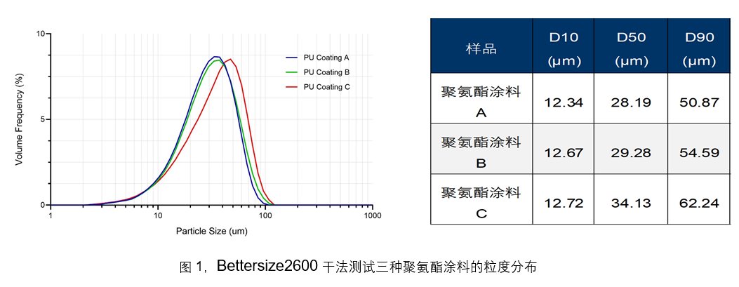 粒度分布的測試方法有很多,激光衍射法測量速度快、動態(tài)范圍寬、代表性好,是粉末涂料行業(yè)中的主流測試方法。根據(jù)進樣方式的不同,激光衍射法還分為干法和濕法兩種。干法以空氣為分散介質直接測量干粉的一種方法,其優(yōu)點是操作快速、簡單且干擾因素較少。為避免液體介質的影響帶來的不確定性,粉末涂料粒度測試中常常選用干法。圖1是Bettersize2600激光粒度分析儀干法測試三種聚氨酯粉末涂料的粒度分布結果。