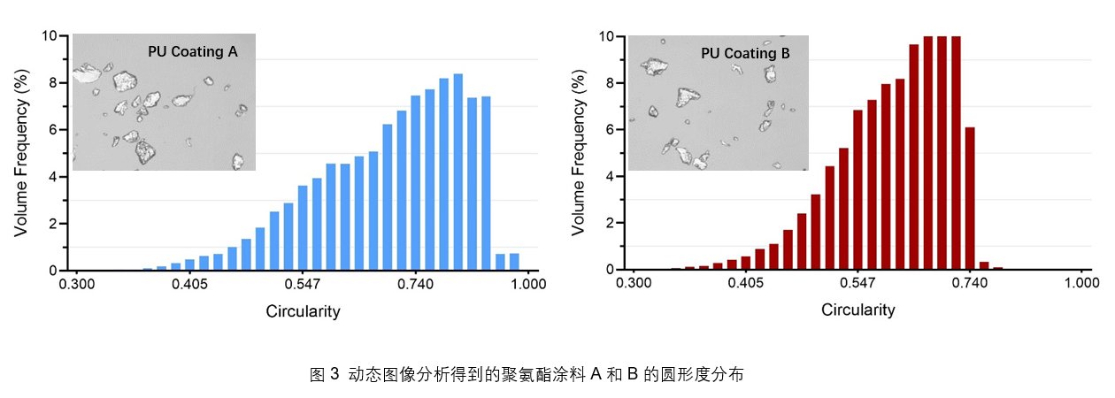 丹東百特儀器有限公司的BT-2900動態(tài)圖像法粒度粒形分析系統(tǒng),由高速攝像機和精密顯微鏡為核心組成,能夠全面呈現(xiàn)粉末涂料顆粒的形狀。圖5是用BT-2900測試兩種聚氨酯粉末涂料的圓形度,A的平均圓形度為0.717,跨度為0.486;而涂料B的平均圓形度為0.654,跨度為0.386。據(jù)此得出涂料A比B的平均圓形度更高,有更好的流化性能。除分析粒形外,BT-2900對粗端顆粒具有更高的分辨力和靈敏度,能準確捕獲到大顆粒,從而有利于粉末涂料產(chǎn)品的質量控制。