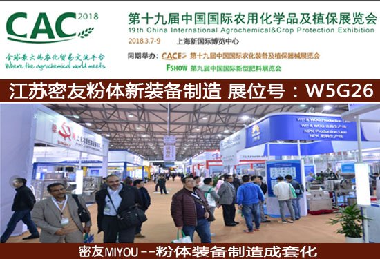 第十九屆中國國際農用化學品及植保展覽會CAC2018---全球農化盛宴將于2018年3月7-9日在上海新國際博覽中心N1-N5及W5館舉辦。江蘇密友粉體新裝備制造有限公司通過一個面向世界、客商更多、規模更大的展會,期待與您再度相約!為傳統農化行業轉型升級提供新思維、新機遇。