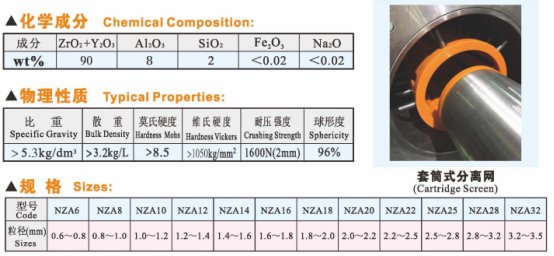 耐諾釔穩定氧化鋯珠(NanorZr-95)采用氧化釔作穩定劑,微珠采用獨創的滴定滾動成型、中溫燒焙定相的工藝制成。形狀有球形、圓柱形兩種。微晶顆粒的直徑小于0.4μm使介質具有優異的耐磨性,小粒徑珠子匹配棒銷式高能量密度砂磨機,而大粒徑球特別適合立式攪拌磨、臥式滾動球磨機、振動磨等設備對各種拒絕污染的漿料和粉料的濕法、干法的超細分散及研磨。