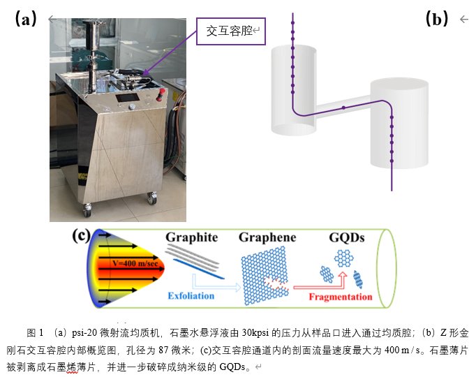 圖1 (a)psi-20微射流均質機,石墨水懸浮液由30kpsi的壓力從樣品口進入通過均質腔;(b)Z形金剛石交互容腔內部概覽圖,孔徑為87微米;(c)交互容腔通道內的剖面流量速度大為400 m / s。石墨薄片被剝離成石墨烯薄片,并進一步破碎成納米級的GQDs。