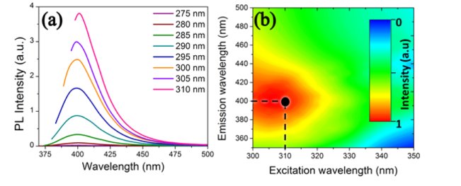 圖3 (a)微流化制備的GQDs的PL圖譜。不同的激發波長顯示出400nm恒定波長下的發射。(b) GQDs的激發和發射等高線圖。黑點表示在310nm激發波長和400nm發射波長下GQDs的大熒光強度。