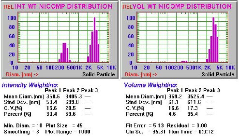 圖9:通過DLS對(duì)“不良”氧化鈰漿料(#2)獲得的PSD結(jié)果(強(qiáng)度和體積-重量)。 由于高斯擬合的高chi-sq值(35),因此使用了多模式“ Nicomp”分析。 雙峰PSD在0.37μm處顯示了預(yù)期的“主要”峰,在3.5μm處顯示了第二個(gè)峰,代表較大顆粒/聚集體的“尾部”。