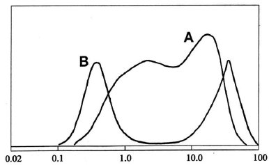 圖10:通過弗勞恩霍夫(激光)衍射獲得的氧化鈰#2的體積-重量PSD。 曲線“ A”代表未經(jīng)處理從樣品獲得的結(jié)果,與預(yù)期的PSD幾乎沒有相似之處。 超聲處理30秒后獲得曲線“ B”,產(chǎn)生以≈0.4μm為中心的預(yù)期峰。 第二個(gè)峰極大地夸大了異常的“尾巴”。