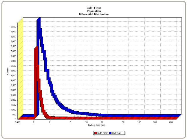 隨附的圖表清楚地顯示了AccuSizer在CMP泥漿過濾前和過濾后定量和解析尾部大顆粒數量的能力。