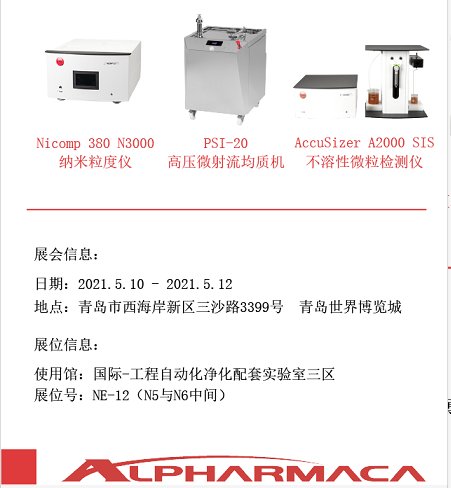 第60屆(2021年春季)全國制藥機械博覽會暨2021(春季)中國國際制藥機械博覽會將于2021年5月10日至12日在青島世界博覽城舉辦。上海奧法美嘉生物科技有限公司攜PSS Nicomp N3000 納米粒度儀、PSI-20高壓微射流均質機、PSS AccuSizer780 SIS 不溶性微粒分析儀亮相。