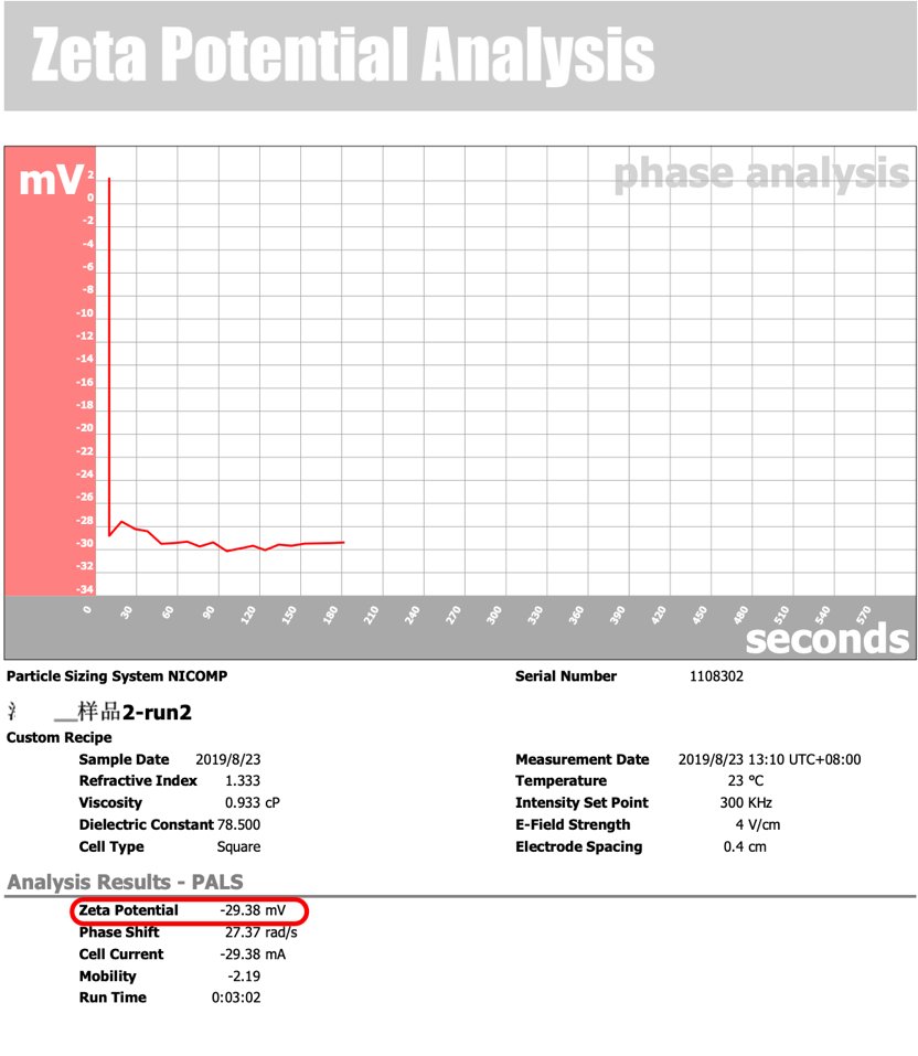 Zeta電位的檢測往往通過納米粒度儀進行檢測,Zeta電位作為穩(wěn)定性的一項參考指標。Zeta 電位是通過檢測粒子與液體接觸的擴散層電荷從而反映的是整個體系的穩(wěn)定程度,一般受到PH值,溫度,特殊添加劑(如表面活性劑)等因素影響,一般認為當絕對值大于30mv,體系較為穩(wěn)定。