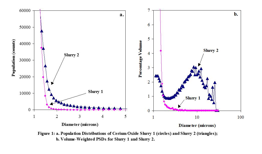 圖1a顯示的是通過SPOS技術檢測兩份氧化鈰CMP slurry樣品得到的總體粒徑分布圖,由圖可知slurry1的分布較好,而slurry2在容器底部產生沉淀,可視為其不穩定。很明顯,slurry2在每一個粒徑通道比slurry1有更多的粒子。這一差異在體積-重量分布圖中表現的更明顯,如圖1b所示。對slurry2來說,粒徑大于2μm的粒子占據了尾部(粒徑>1μm)固體粒子體積的大部分。此外,使用SPOS技術能夠計算出任一特定粒徑范圍內被檢測粒子體積的絕對百分比。在slurry1中,粒徑大于1μm的粒子的體積占所有slurry中粒子體積總和的0.25%,而在slurry2中,此值上升為0.68%。這些結果與實驗現象一致:slurry2比slurry1有更顯著的聚集。雖然對于每一份slurry來說,位于粒徑分布圖尾部的粒子其絕對體積很小,但是它們對slurry性能的影響卻是巨大的。