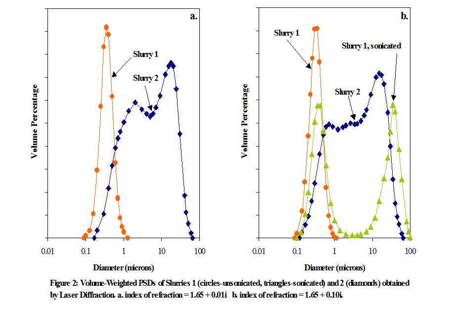 圖2a,b顯示的是通過激光衍射對兩份相同氧化鈰樣品進行檢測所得到的粒徑分布圖(體積-重量分布)。圖 2a假設折射率n = 1.65 + 0.01i,圖2b把吸收系數提高10倍,即假設折射率n=1.65 + 0.1i,兩者檢測的其他原始數據相同。從中可以得出一些結論:如預期的那樣,slurry1的粒徑分布圖非常好,具有一個以0.3μm為中心、相對狹窄、接近對稱分布的峰。然而,虛數折射率的改變引起平均粒徑漂移10%。