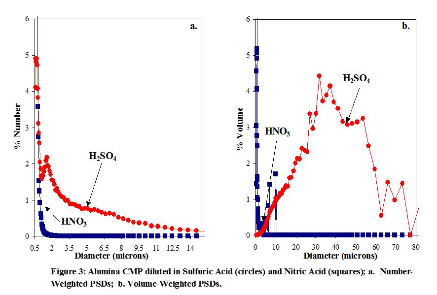 圖3顯示了兩份氧化鋁CMP slurry經SPOS檢測所得到的粒徑分布圖(以粒子百分數表示)。一份slurry用硫酸稀釋,另一份用硝酸稀釋。每份稀釋slurry的pH值都調到3,得到一樣的酸度。奇怪的是,這兩份樣品的粒徑分布圖差異顯著。將硫酸稀釋的slurry與硝酸稀釋的slurry相比較,在大于0.5μm處有較寬的尾部大粒子分布。前者樣品中有70μm大粒子,而后者則沒有粒徑大于10μm的粒子。很明顯,硫酸的加入引起了氧化鋁粒子嚴重的聚集和絮凝。原因是:粒子間靜電斥力有助于膠體混懸液的穩定,離子強度對粒子間靜電斥力有“屏蔽作用”;在恒定pH值條件下,加入硫酸比加入硝酸使離子強度增加得更多,因而破壞了靜電斥力,大大地促進了絮凝。