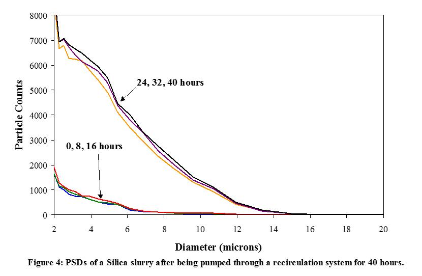 最后,圖4顯示SPOS檢測一份二氧化硅CMP slurry所得到的粒徑分布圖,并將粒子數量作為傳遞系統中循環時間的函數來分析。可以看出,在最初16小時循環過程中,粒徑分布圖中粒徑大于2μm的粒子個數沒有顯著變化,尾部粒子總數大約為10,000粒,所占體積為0.002%。然而,循環24小時后,slurry 明顯表現出穩定性下降的跡象。尾部粒子總數增加到100,000粒,其所占體積也增加到0.016%。這些結果都是十分重要的,因為它證明了泵帶來的壓力對二氧化硅CMP slurry有去穩定作用。本體之外尾部大粒子/聚集粒子的體積分數總共才變化了0.014%,這么小的變化,使用任何常用的整體性檢測儀是完全檢測不出來的。