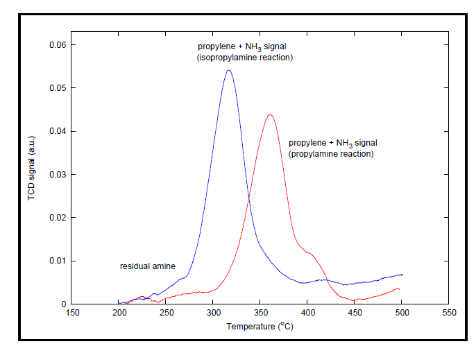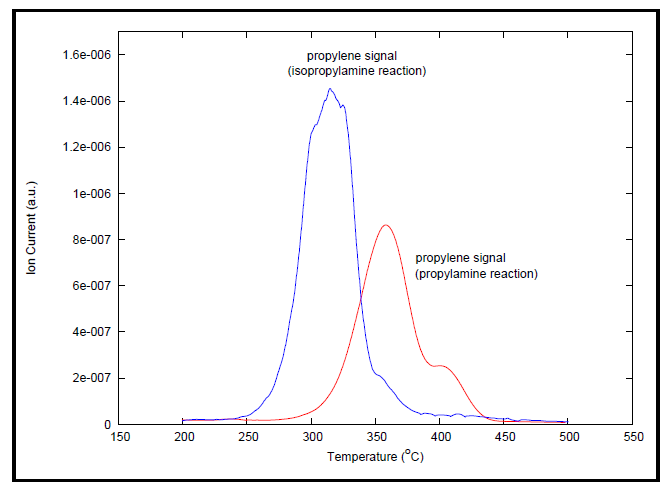 Y型分子篩活化后即進行脈沖化學吸附。在此步驟中,采用惰性氣體氦氣,通過流經一個5cm3的loop環向樣品中注入10次丙胺蒸汽,以確保樣品吸附飽和。分析的最后一步是程序升溫脫附(TPD)。在這一步中,質譜儀開始掃描檢測產物丙烯信號。數據是在200°C到500°C的程序升溫期間采集得到。