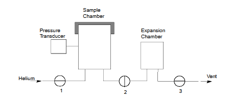 泡沫塑料又稱微孔塑料,是由聚合物構成的膜壁和由膜壁分割成的許多小孔組成。本篇文章中測量的硬質泡沫塑料是泡沫塑料的一種,它是指無柔韌性,壓縮硬度大,應力達到一定值能產生形變,解除應力后不能恢復原狀的泡沫塑料。人們通常利用硬質泡沫塑料的隔熱性和力學特性將其用作熱絕緣材料和隔音材料,管道和容器等的保溫材料,漂浮材料及減震包裝材料等。硬質泡沫塑料中包含很多封閉的、獨立的、開放的和連通的孔,不同的孔結構會影響其產品性能。而硬質泡沫塑料的開孔率作為其絕緣質量的指標,是產品生產和評估過程中非常重要的一個需要控制的變量。因此,一個簡便易行且精確的開閉孔率測試方法,對于發泡工藝研究及產品質量控制都有實際意義。在ASTM D2856中提供了空氣比重法測定開孔率的步驟,但是在此標準中所使用的設備已經不再生產。目前,通過美國麥克儀器公司AccuPyc系列真密度儀(圖1)可以精確的測定硬質泡沫塑料的開閉孔率。本文詳述了如何使用AccuPyc系列儀器進行開孔率測試,并對每一個詳細步驟和計算過程都進行了詳細的說明。美國麥克公司的Accupyc儀器基于理想氣體狀態方程,采用氣體置換法,測量硬質泡沫的開閉孔率,符合GBT10799和ASTM D2856標準。Accupyc測試硬質泡沫塑料的開孔率方法,操作簡便,結果準確,測試樣品用量少。僅需要從待測材料中切下兩個邊長為2.5 cm的正方體,接著測定樣品的體積,此時一些閉孔由于切割而變成開孔,必須對其進行校正,求出校正后的開孔體積,才能如實表征樣品的泡孔結構并正確評價產品性能。因此,需要在測試樣品上進行第二次等面積切割,并再次測定體積,完成由閉孔變成的開孔體積的校正計算。圖2為Accupyc的設備示意圖。AccuPyc II采用氣體置換法原理,利用He作為氣體介質,置換材料空隙及孔隙中的空氣,獲得材料的實際體積數據。如圖所示,樣品在樣品倉中形成密封環境,打開1閥,氣體進入樣品倉,達到一定壓力后,閥門關閉,待樣品與氣體達到平衡后,壓力傳感器讀取此時壓力P1。之后2閥打開,氣體則會從樣品倉擴散進入擴展倉,待兩個倉內的氣體和樣品達到平衡后,壓力傳感器讀取此時壓力P2。之后基于理想氣體狀態方程PV=nRT,換算出材料的真實體積V,V進一步用于開孔率的計算。