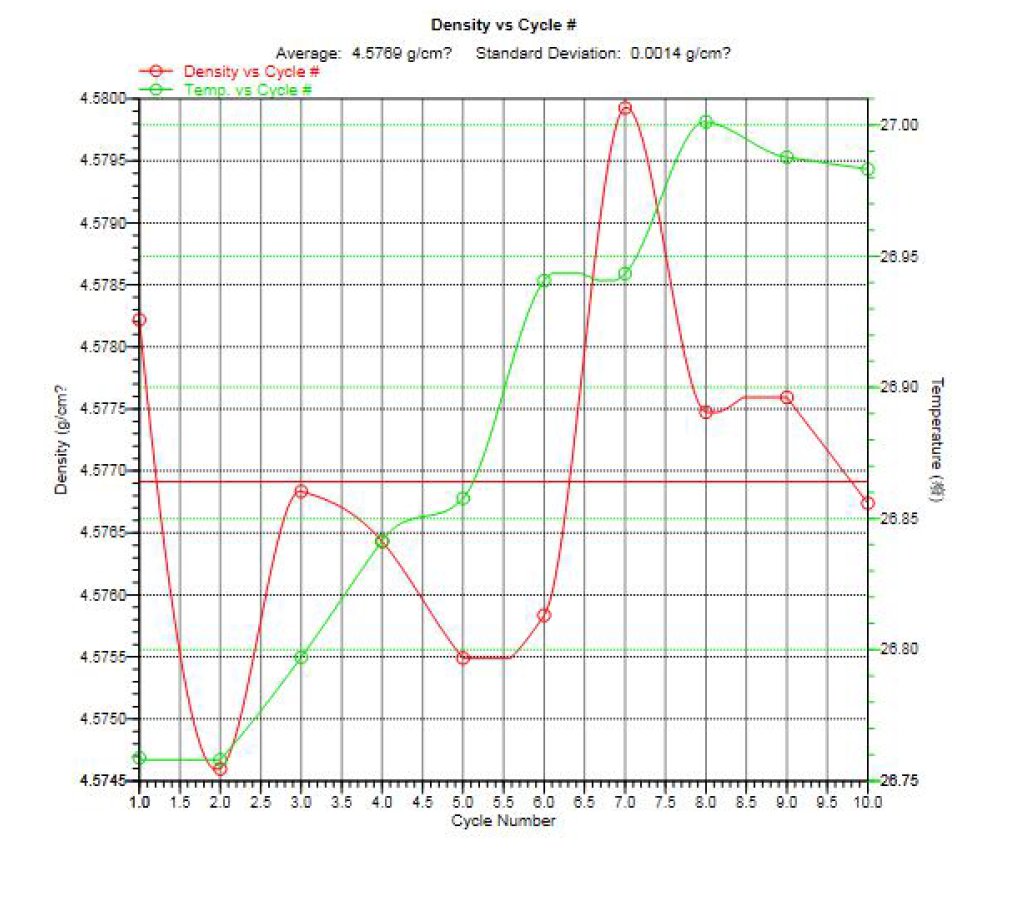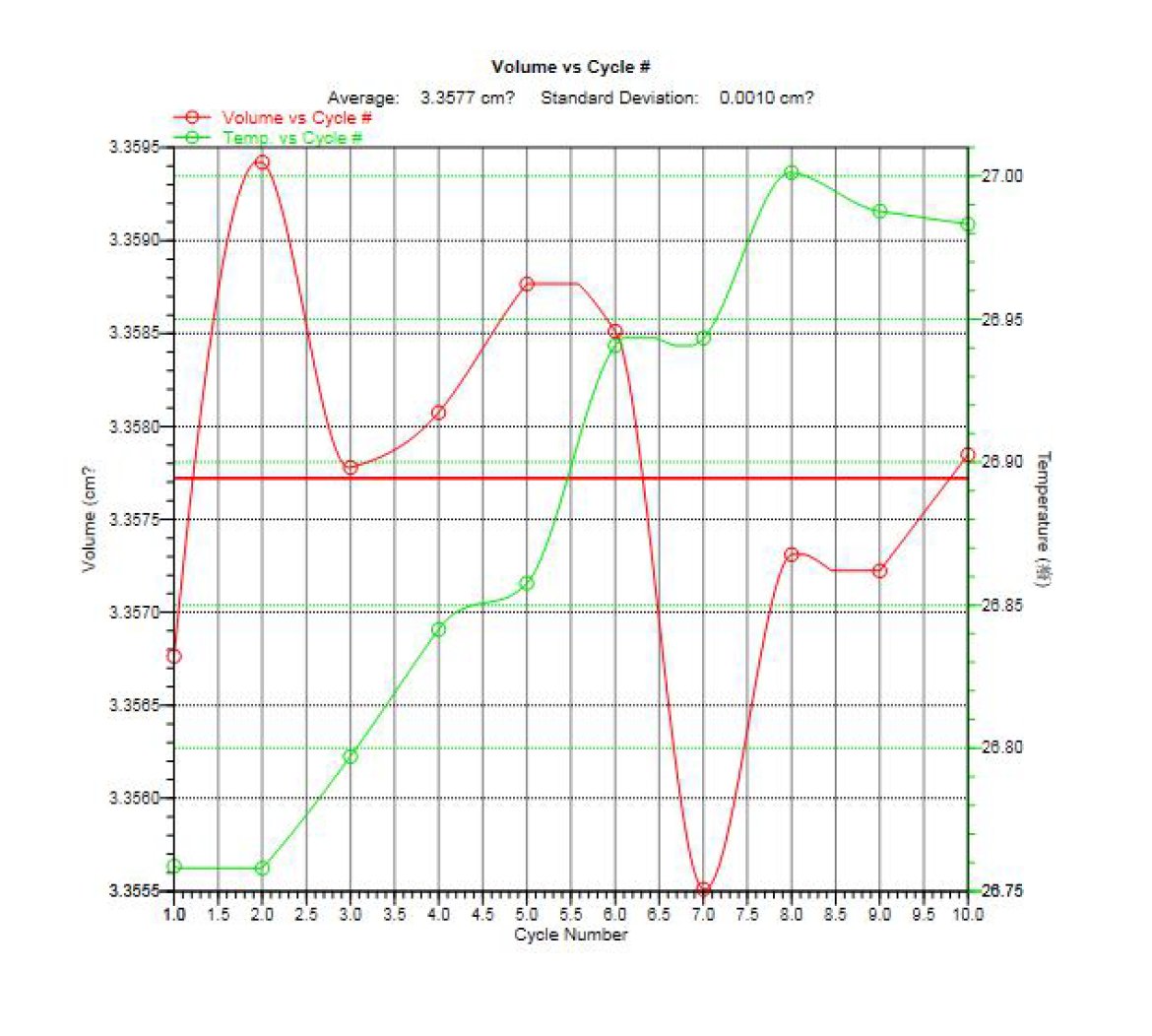 接下來我們以體積對循環次數做圖,并以平均體積做標準線,可以得到下圖所示的結果。圖中紅色的圓點是十次的體積測試值,中間紅色的水平線為體積平均值。通過這個圖不難看出,十次測試的體積結果是圍繞著體積平均值波動,非常穩定,并未出現持續走低等異常現象。該圖中的綠色曲線是儀器內部的溫度變化曲線。從圖中可以看出,整個測試過程中,儀器內部溫度僅由26.76℃增加到26.98℃,過程中所到達的最高溫度是27℃。整個測試過程中,最大溫度浮動不超過 0.3℃。并且在溫度浮動到27℃時,儀器自動散熱,將溫度穩定下來。