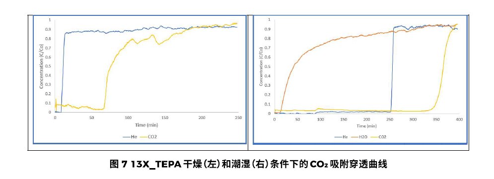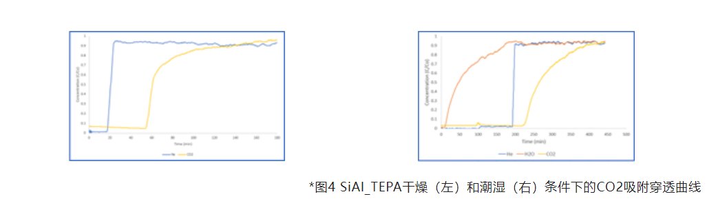 在潮濕和干燥條件下,SiAl_Plain的CO2穿透曲線如圖2所示。左圖中說明CO2的穿透曲線比He標定氣體坡度小,一是因為CO2濃度非常低,二是因為硅鋁(SiAl)顆粒較大導致的一些傳質限制。對比干燥(左)和潮濕(右)兩組結果,我們可以觀察到水的存在導致SiAl_Plain的CO2吸附量顯著下降,這說明CO2和水之間存在競爭吸附。