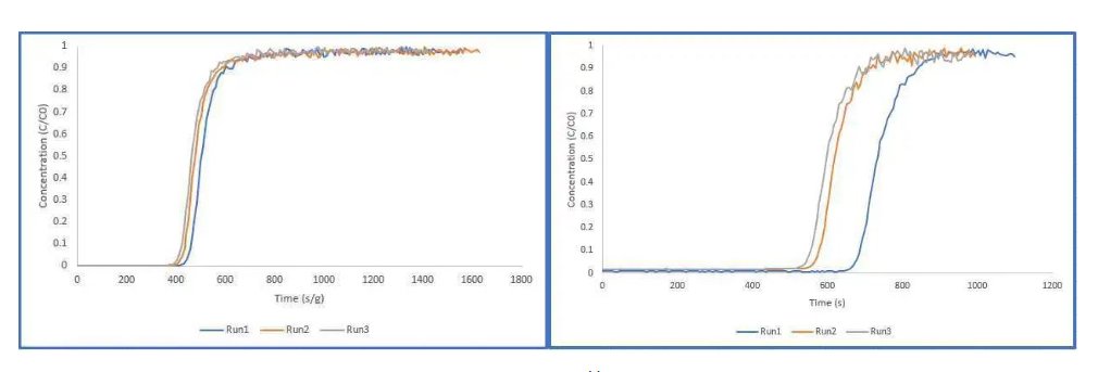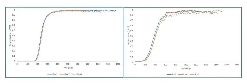 圖1:沸石13X(左)和5A 分子篩(右)CO2 穿透曲線