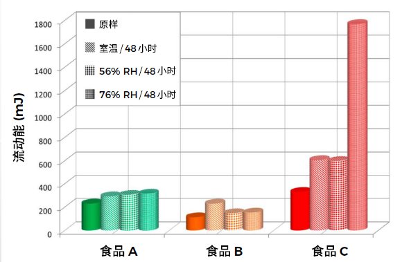 食品 B 出現不同的趨勢,表明水分吸收并非一定是不利因素。與室溫條件的樣品相比,56% 相對濕度條件下觀察到的流動能降低。吸收的水分會降低靜電力,而在一些情況下,表面水分會起到潤滑劑的作用,從而減小顆粒相互作用的強度。