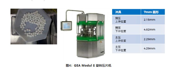 進(jìn)一步使用 GEA Modul S 旋轉(zhuǎn)壓片機(jī)把 4 種不同條件下生產(chǎn)出的經(jīng)濕粒、干燥、磨粉以及潤滑后的最終顆粒進(jìn)行壓片,隨后使用 Dr. Schleuniger Pharmatron 8M 壓片硬度測試儀測試壓片的強(qiáng)度(見圖 4)。