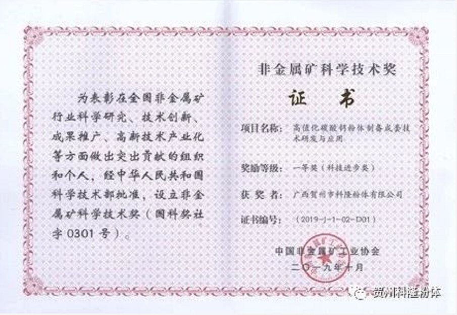 在這次非金屬礦工業大會上,由廣西賀州市科隆粉體有限公司牽頭,合肥學院、賀州學院一起聯合參與的項目《高值化碳酸鈣粉體制備成套技術研發與應用》榮獲2019年度非金屬礦科學技術一等獎,這是產、學、研、用協同創新的科技成果。