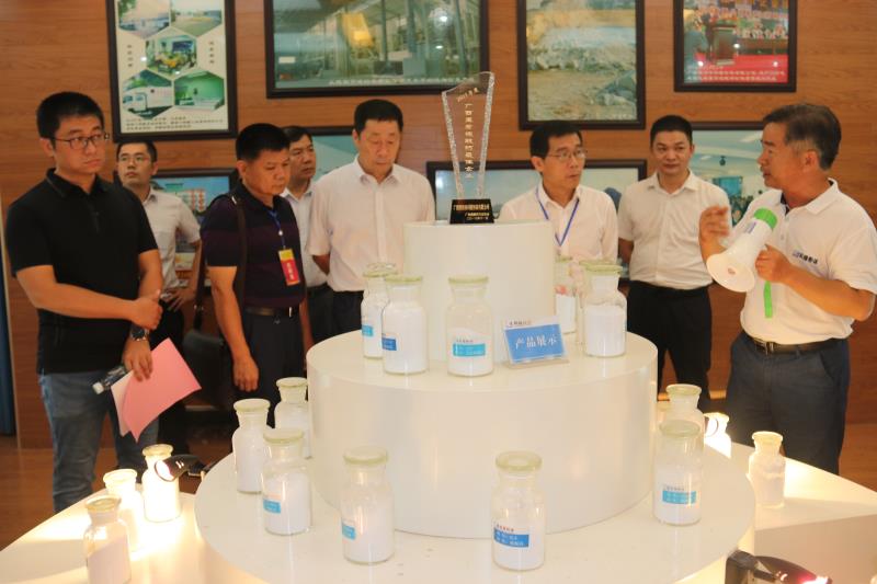 接著,考察團參觀了科隆公司展廳。 陸元鴻說,7月10日是科隆公司24歲生日,在科隆公司過24歲生日不久迎接各位領導和嘉賓的到來,是公司的榮幸。公司在重質碳酸鈣行業深耕細耘20余年,獲得了“國家高新技術企業”、“中國碳酸鈣行業重鈣十強”、“全國五一勞動獎狀”、“國家知識產權優勢企業”和“廣西重質碳酸鈣工程技術研究中心”等殊榮,參與了《碳酸鈣分析方法》等國家標準及《工業用重質碳酸鈣》等行業標準的制定。產品廣泛用于人造石、造紙、涂料、橡膠、塑料、油墨、建材及日用化工等行業。重質碳酸鈣在各行業上主要是作為綠色環保填充料使用,它是目前最廉價的白色填充料,主要作用一是降低產品成本,二是改變產品性能。