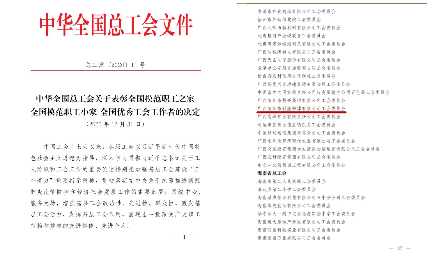 近日,廣西賀州市科隆粉體有限公司工會委員會獲中華全國總工會表彰,并被授予“全國模范職工之家”榮譽稱號。該稱號是全國工會系統表彰先進集體的最高榮譽,也是國家對基層工會工作的最高褒獎。