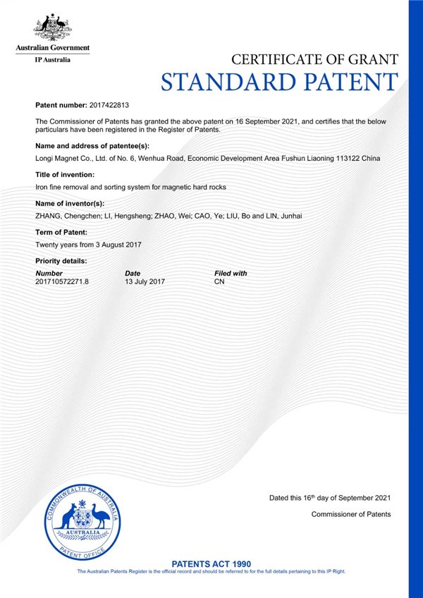 隆基電磁頑石除鐵系統傳捷報,收獲澳大利亞專利!