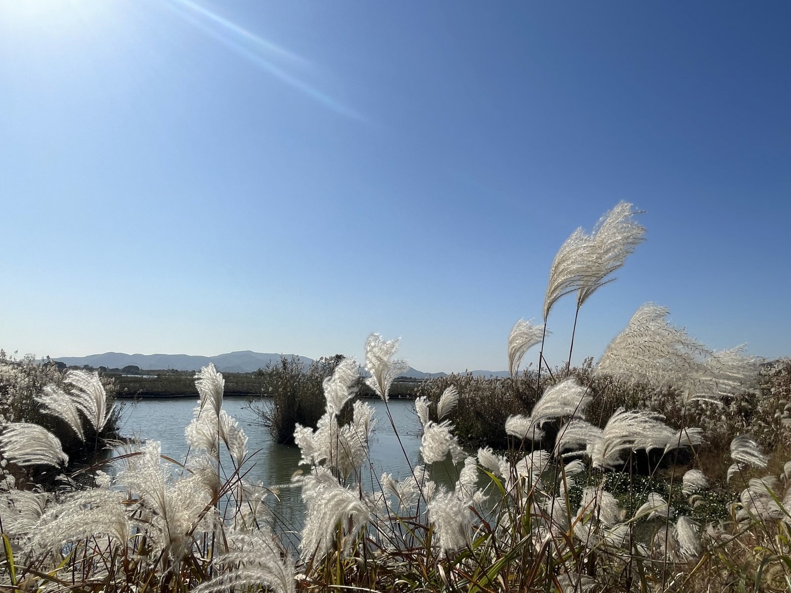 我們沿著木制的階梯踱步而下,踏上微微搖晃的小船,三三兩兩地坐下。一只船兒不大不小。船頭調(diào)轉(zhuǎn),水波暈開層層漣漪。船兒行到水面最寬闊處,一陣又一陣的風拂過蘆葦深處,卷著蘆葦花迎面撲來。