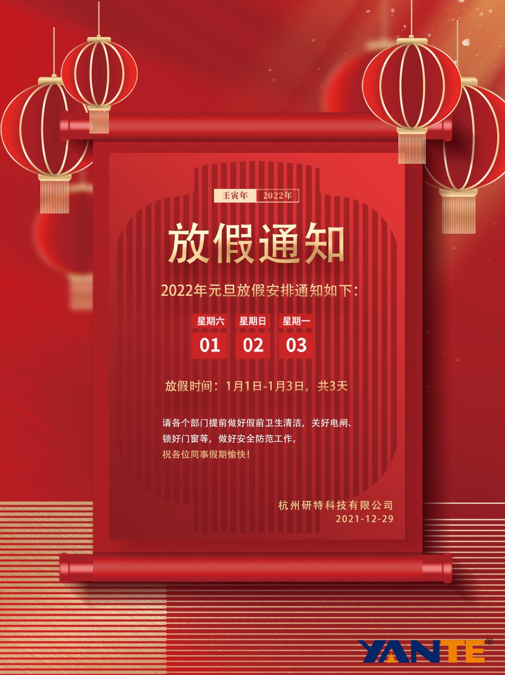 辭舊迎新,風(fēng)鵬正舉。2022年元旦來臨,研特科技在此向大家獻(xiàn)上最真摯的祝福和誠摯的謝意。根據(jù)國務(wù)院辦公廳放假安排,現(xiàn)將放假時間及注意事項通知如下: