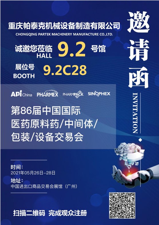 第86屆中國醫藥原料藥中間體包裝設備交易會(API&CHINA-PHARM)將于2021年5月26-28日在羊城廣州中國進出口商品交易會展館隆重召開,制劑、粉體工程專家— 機械設備制造有限公司將重磅亮相。
