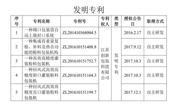 江蘇創新包裝科技有限公司2017年度獲得4項發明專利和6項實用型專利,使公司共擁有發明專利5項、實用型專利21項。這些專利的取得是公司重視科技研發、公司科技人員勤奮工作的結果。這些專利技術正逐步應用到產品中,使我公司智能包裝碼垛線、定量自動包裝機有更高的科技含量,不斷提高了公司產品的品質,受到了政府的獎勵、同行的肯定、客戶的歡迎。