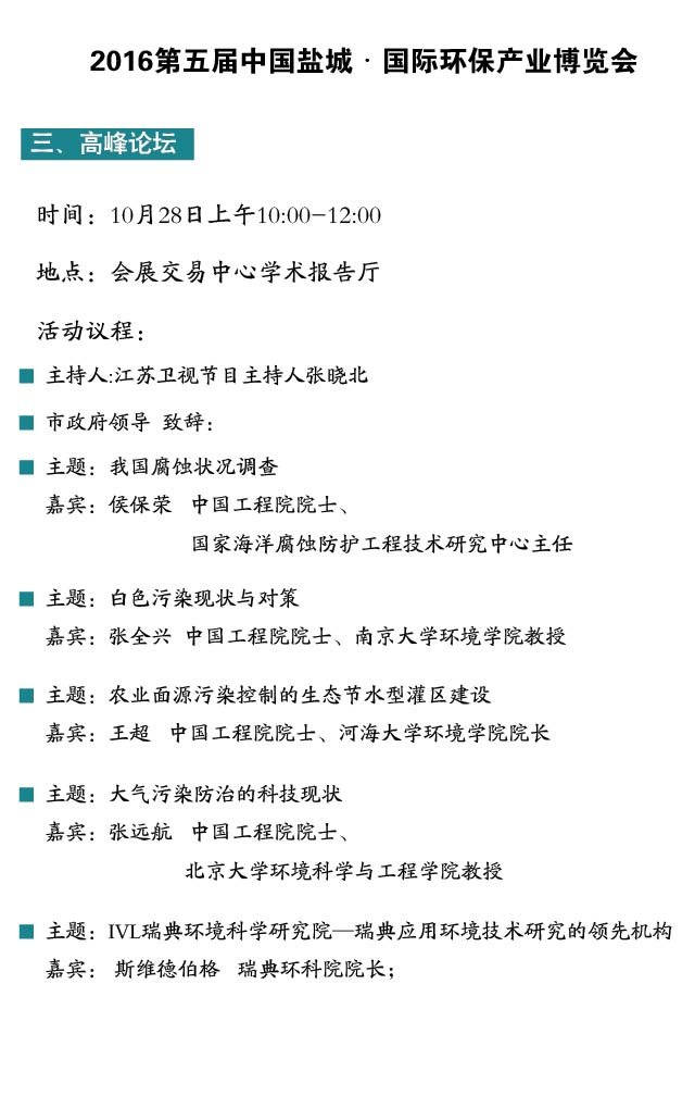 除了展覽以外,展會期間將舉辦多項同期活動。本次展會擬邀明尼蘇達大學教授裴有康,中科院院士陶文銓、孟偉、郝吉明等國內外知名的院士學者10月28日相聚鹽城與企業面對面交流。由鹽城市人民政府、江蘇省環保廳、鹽城市環保局等單位將共同舉辦“鹽城污染治理技術交流與對接洽談會”,工業專場重點邀請化工、電鍍、焦化、水泥、造紙、印染、冶金、機械(涉及噴漆、涂裝工藝)等400多家污染重點監控名單企業參加,邀請環保主管部門、知名企業及最新技術進行“精準對接”;農村專場將匯集畜禽廢棄物處理處置及農村水環境領域高端專業人士,對農村環境治理政策、市場、技術與商業模式等方面進行深入的探討交流。