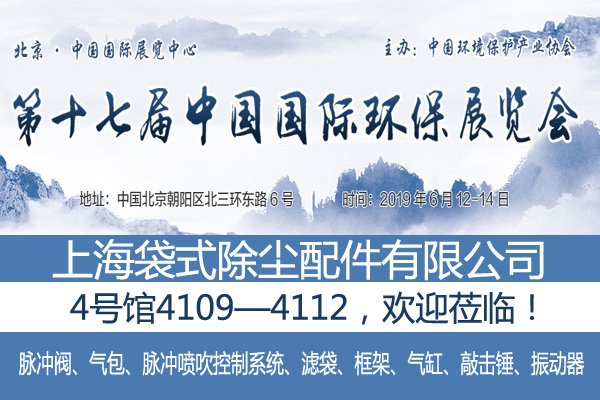 第十七屆中國國際環保展覽會(CIEPEC2019)定于2019年6月12日-14日在北京·中國國際展覽中心舉行。上海袋式除塵配件有限公司攜手寧波盛達陽光自動化科技有限公司共同亮相展會。
