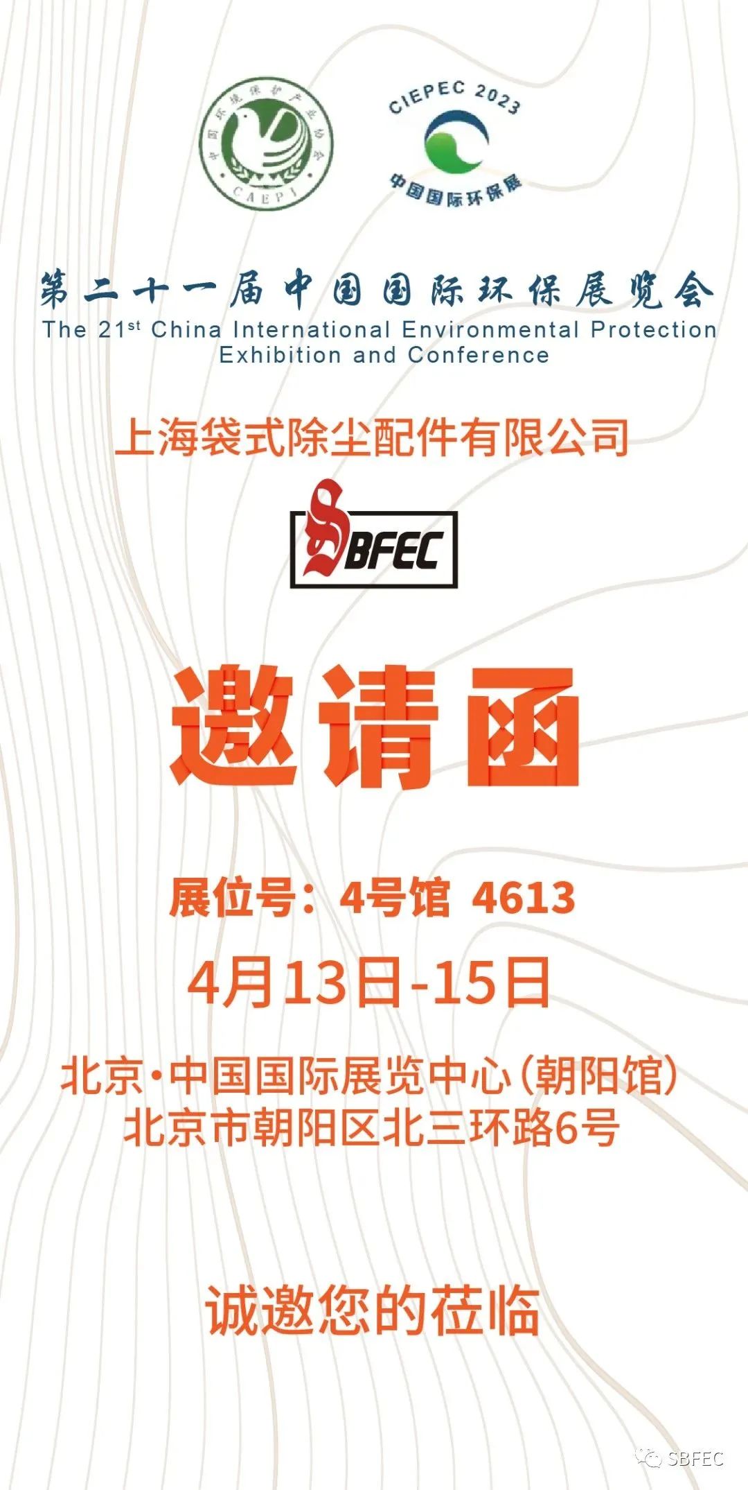 CIEPEC 2023第二十一屆中國國際環保展覽會,將于2023年4月13日至15日在北京.中國國際展覽中心舉行,屆時,上海袋式除塵配件有限公司(SBFEC)誠邀您蒞臨參觀,共同探討環保領域的最新發展趨勢和應用技術。