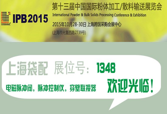 IPB 2015第十三屆中國國際粉體加工/散料輸送展覽會將于2015年10月28-30日在上海跨國采購會展中心舉行,有200多家業(yè)內(nèi)知名企業(yè)共襄盛會。袋式除塵配件專家--上海袋配公司應(yīng)邀參展,展位號:1348。這是上海袋配第二次參加上海粉體展,屆時袋配公司將現(xiàn)場展示電磁脈沖閥、清灰控制儀、濾袋、濾袋框架、專用配件、電氣控制柜及過濾筒等系列產(chǎn)品。