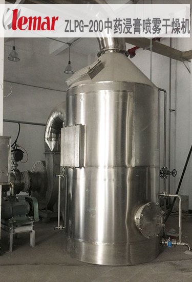 濟川藥業(yè)集團此次訂購的ZLPG-200中藥浸膏噴霧干燥,塔徑為5米,塔高為12米,蒸汽耗量為500Kg/h,干燥進風溫度t1=180℃,干燥排風溫度t2=90℃。分別用于干燥三拗片浸膏和小兒豉翹浸膏物料,該物料的PH值在4—6范圍內(nèi),初始水分: 80 ~85%(視物料的流動性可提高),物料最終水分:≤5% (粉體吸濕性強);水分蒸發(fā)量: 200Kg/h;料液溫度:常溫~85℃;料液比重: ≤1.1g/cm3。