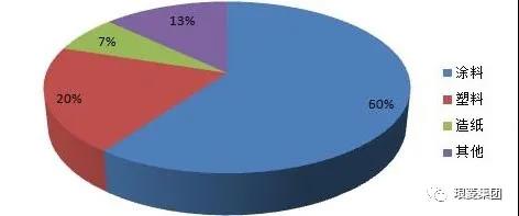 鈦白粉廣泛應用于涂料、 塑料、造紙、印刷油墨、化纖、橡膠、化妝品等工業(yè)應用領域,其中涂料占60%、塑料占20%、造紙占14%、其它占6%。