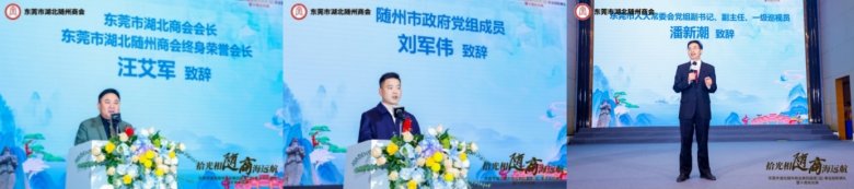 隨州東莞市湖北商會會長、東莞市隨州商會終生榮譽會長汪艾軍,來自隨州的家鄉(xiāng)領(lǐng)導(dǎo)——隨州市政府黨組成員劉軍偉,東莞市人大常委會黨組副書記、副主任、一級巡視員潘新潮等領(lǐng)導(dǎo)也上臺發(fā)表了致辭。