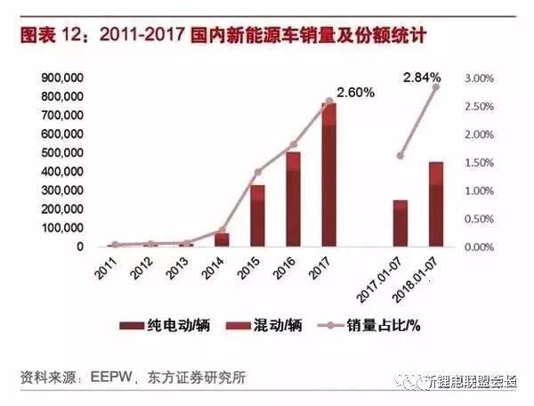 國內新能源汽車產銷量從2011年不足1萬輛增加到2017年近80萬輛,6年復合增速超過100%,2017年國內新能源汽車產銷量同比增長50%以上,2018年以來繼續保持高增長,前7個月國內新能源汽車產銷量雙雙突破45萬輛,同比增長近80%,占國內汽車總銷量的比例達3%以上,汽車電動化的趨勢已經明朗。