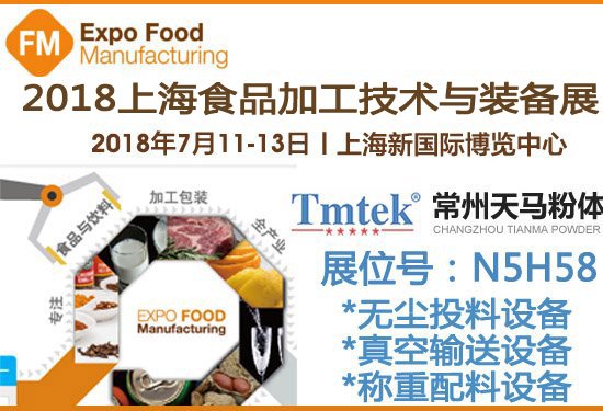 EXPO Food Manufacturing 2018上海食品加工技術與裝備展將于2018年7月11-13日在上海新國際博覽中心隆重舉辦。常州天馬粉體科技有限公司應邀參加,展位號:N5H58,歡迎蒞臨商洽!