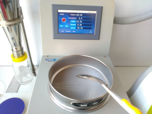 HMK-200空氣噴射篩分法氣流篩分儀是一款利用空氣噴射篩分法來測量粉體粒度分布的實驗室用篩分儀器。此儀器由操作面板、篩盤、標準篩、噴嘴、電機及吸塵器組成。采用關鍵技術的HMK-200配備美國進口高端渦流發生器,利用噴嘴將吸塵器負壓產生的氣流轉化成動能,驅動粉體上升并與篩蓋相碰撞,去除聚合顆粒的粉體繼而被負壓吸向標準篩。較大顆粒被留在篩網上面,較小顆粒被吸入吸塵器,從而實現對粉體的理想篩分。HMK-200空氣噴射篩可以通過7寸液晶顯示屏進行觸屏控制,實時顯示儀器的工作狀態。本儀器可以通過RS-232接口與電子稱相連。內置微處理器可以對結果進行自動判斷、計算、存儲、查找、打印、審計追蹤。